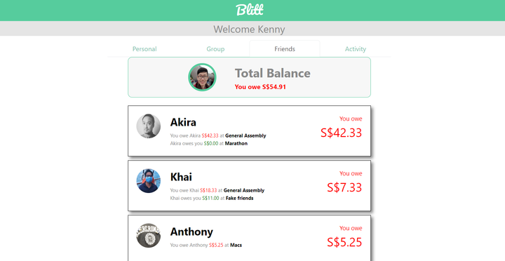 A bill splitting app that allows user to record a bill, do easy calculation with the split function and keep a record of all owings of user from group or individual perspective. User can easily add friends into groups and start adding bills right on the go. There is also a report page that shows your total spending on different categories of expenses, as well as log page to show all activities done by you or other users in the same group.