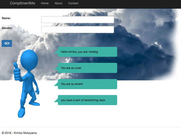 Built an app that pays you compliment online. This was done in roughly 3 days. Technologies used: ASP.NET 2.1 (C#), Comoplimentr API, Animista, Newtonsoft