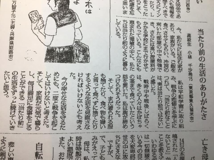 「当たり前のありがたさ」 学校で書いた作文が、新聞掲載されました。