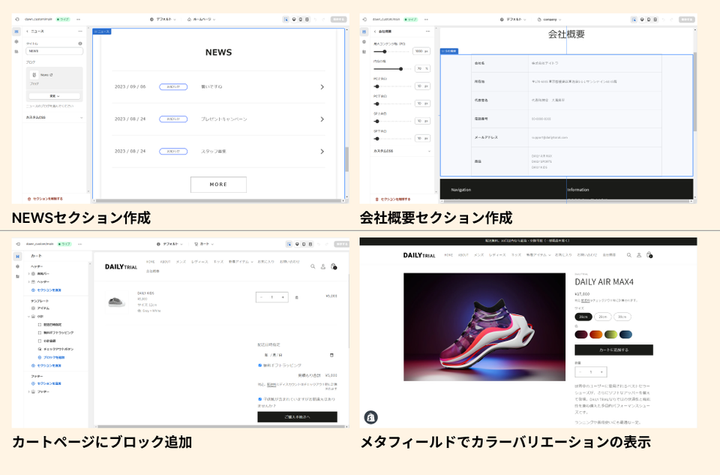 ノーコードだけでなくデザインカンプからの構築が可能です 【 ShopifyでのECサイト構築 】 ・Shopifyにてテーマを使用したサイトの構築 ┗基本設定から構築まで丸ごと対応が可能です ・テーマにないセクションの自作 ┗ShopifyCLIを使用しデザインカンプの再現が可能です