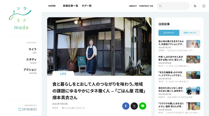 自然体な生き方を考えるメディア『ソラミドmado』で、島根県大田市で「ごはん屋 花種」を営む畑本真衣さんにインタビューしました。 自然体な暮らしを体現する人を訪ねる「暮らしから探す、私らしさ」のいち記事として、食と暮らしをとおして地域と向き合う畑本さんに、その思いがどこからやってくるのか聞きました。
