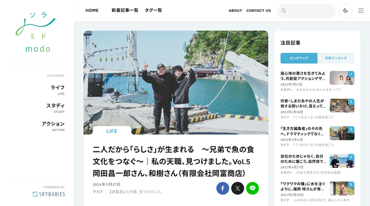 自然体な生き方を考えるメディア『ソラミドmado』で、島根県大田市で岡富商店を営む岡田昌一郎さん・和樹さんにインタビューしました。 「天職に就いている」と胸を張って自分らしく活躍する人にインタビューを行い、「天職とは何たるか」を探る連載企画「私の天職、見つけました。」のいち記事として、お二人がご自分の仕事を天職だと思うにいたるまでのエピソードを聞きました。