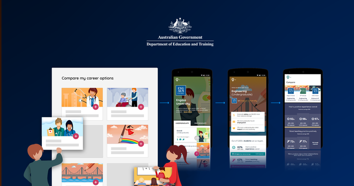 高等教育機関の品質指標が比較できる教育省の既存サイトの分析、及びユーザの行動を観察した結果、教育機関の検索・閲覧・比較の分野においてのユーザーフローとデータ提示に根本的な問題があると結論づけました。 学生たちは進学する大学や高等教育機関を決める際、どのようなマインドセットで臨み、どのように情報招集や比較をしたいだろうか。その答えを絞り出すため、いくつかのワイヤーフレームコンセプトをフォーカスグループでテストし、学生達にとってより良い『進学先選び』の体験を設計しました。 担当:コンセプト、ワイヤフレーム、プロトタイプ、イラスト