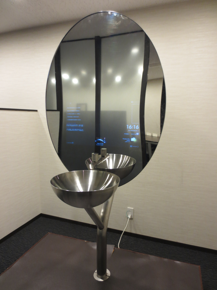 鏡に情報を映し出す近未来型洗面台スマート洗面台は、洗面台の鏡の部分にAndroid OSを組み込むことによって実現した、これまでにない鏡型情報端末です。 手をかざして操作できるようになっており、鏡を汚してしまう心配もありません。体重計を内蔵しており、ヘルスケアもサポートいたします。