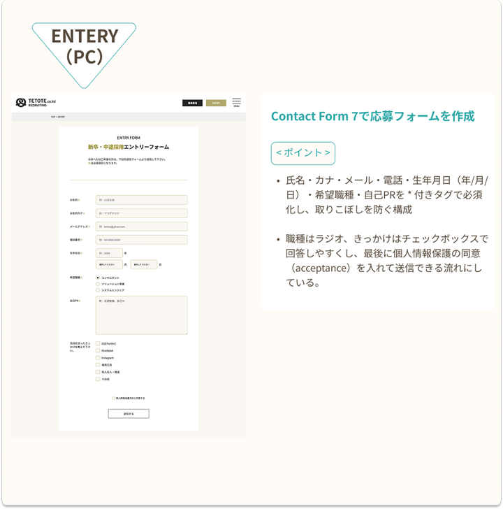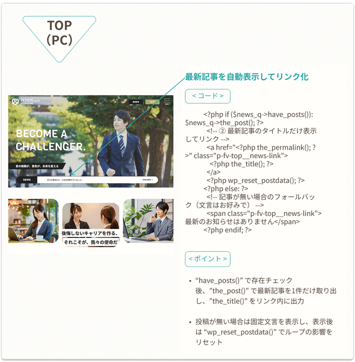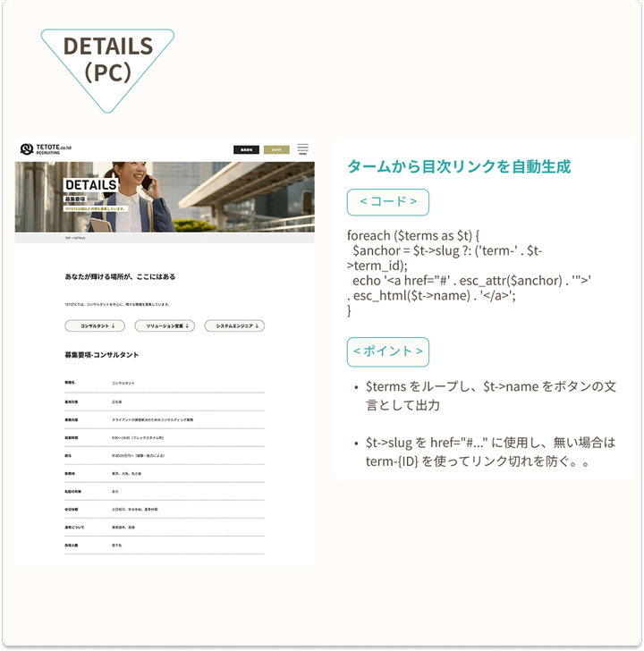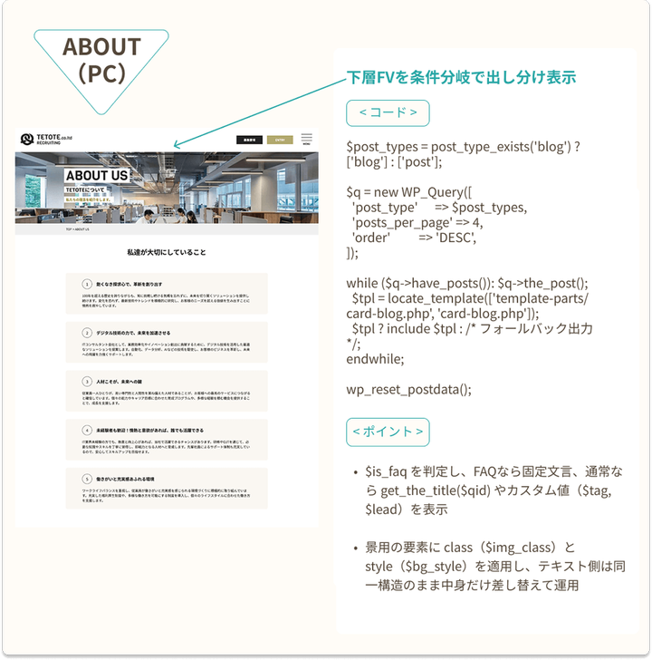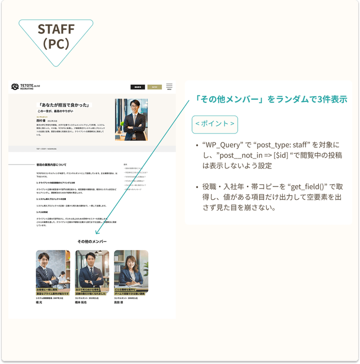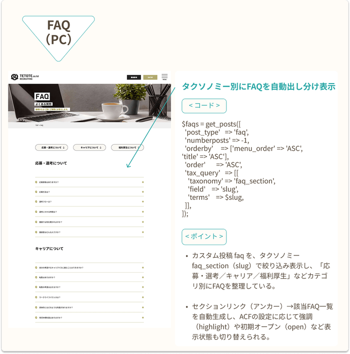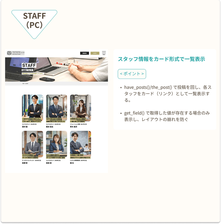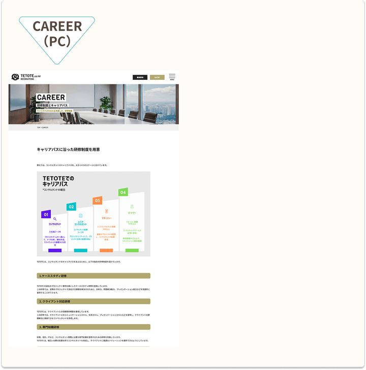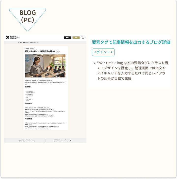 サイト閲覧ID/PW demo / demo 制作概要: オンラインスクールの上級課題として、18枚のデザインカンプをもとにしたWebサイト制作に取り組みました。 課題には以下のような厳しめの条件が設定されていました。 ・コーディング初稿の提出期限:開始から24日以内 ・初稿のミス数:10個以内 ・JavaScriptを用いた複数のインタラクション実装(指定あり) 実装内容としては、例えば以下のような要件がありました。 ・ファーストビューで、画像がふわっと切り替わるアニメーション ・トップページで、スクロールするとヘッダーが下層ページと同様のデザインに切り替わる挙動 ・右サイドバーに追従する目次を配置し、クリックで該当箇所へスムーズスクロール ・スクロール位置に応じて、目次の現在の話題を自動でアクティブ表示 ・カスタム投稿を用いたコンテンツ管理 など 限られた時間の中で、実装の優先度付け・構成の整理・細かな仕様の洗い出しを行いながら進めた結果、18日目に初稿を提出し、ミスはわずか2点のみで合格することができました。 提出スピードだけでなく、全体のクオリティと実装の正確さについても高い評価をいただき、「スピードと品質を両立したコーディング」が自分の強みのひとつだと実感できた経験です。 担当範囲: 静的コーディング/Wordpress構築 使用スキル: HTML / CSS(Sass)/ JavaScript / PHP / WordPress / gulp 制作期間: 21日