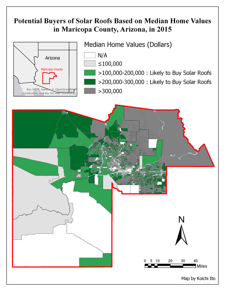 アリゾナ州マリコパ郡における太陽光発電パネルのターゲットカスタマーの分布マップ
