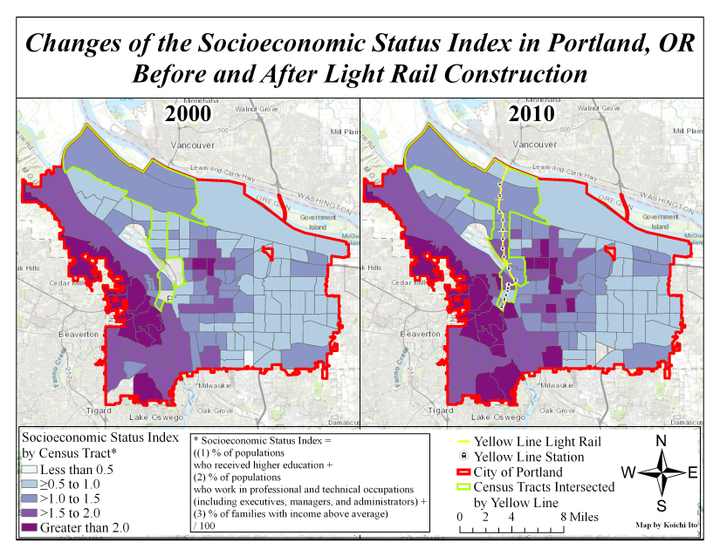 ポートランドに於けるLRT敷設の社会経済的影響マップ