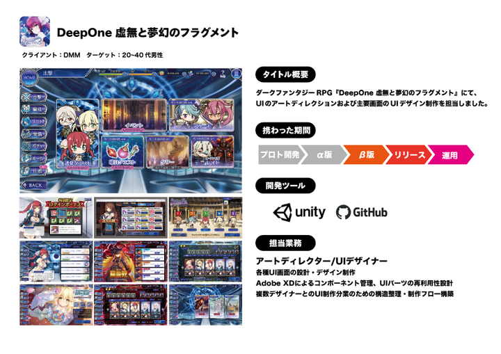 UI/UXデザイナー歴12年、アートディレクター経験7年。 スマートフォンゲーム業界を中心に、大手〜スタートアップまで幅広い開発環境に対応してきました。 UX改善、動画制作、広告演出、レギュレーション設計、制作フロー・外注・モーション・3Dの管理など、幅広い領域を担当。