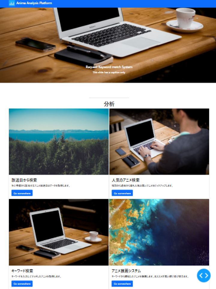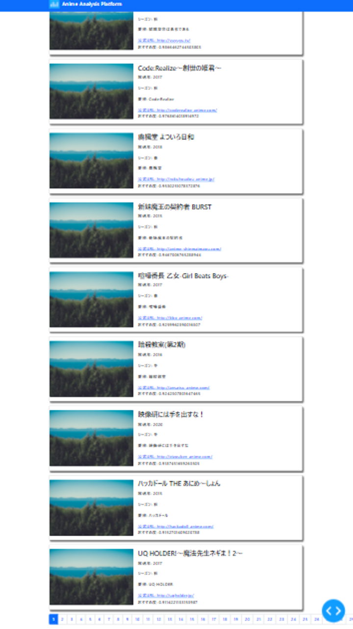 アニメのタイトルをベクトル化することで、類似度を用いてキーワードからおすすめ順に取得し表示します。フロントにはdashを使用して、バックエンドでAPIからデータの取得と機械学習による計算を行います。firebaseと連携することでユーザーの行動履歴をデータベースに蓄積します。 また、時系列で常に新しいデータを取得するので最新のアニメにもします。 フリーで使えるダミー画像を使っています。
