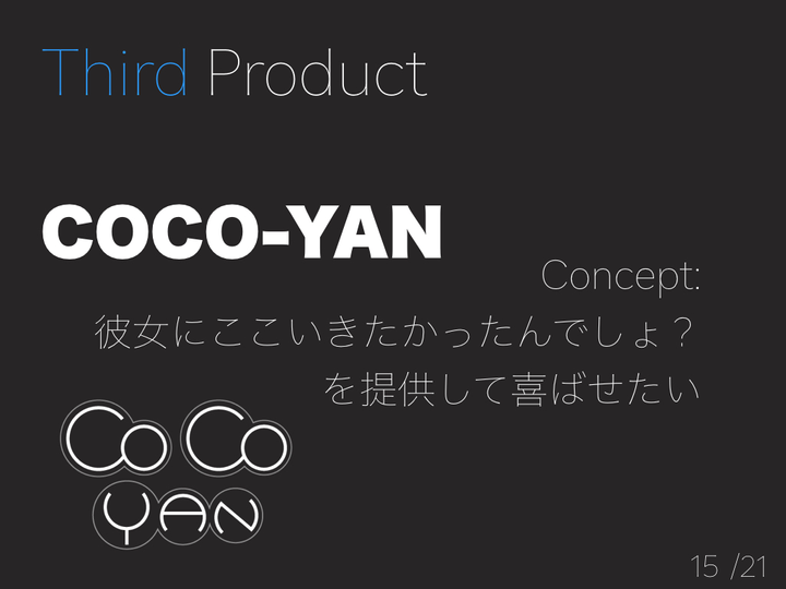 COCO-YANは誰かの行きたかった場所をtwitterから抽出して提案してくれるwebサービス。普段からSNSなどには行きたい場所などは無意識のうちにつぶやいていることが多いです。そのため、そのつぶやきを解析することによってその人が行きたいと思っている場所を解析結果から提案してくれます。 具体的に使用を想定したシーンは彼女持ちの彼氏が彼女が行きたかった場所をこのサービスを使ってこっそりと知り、そして提案して幸せにしてあげようというシーンです。 サービスのアイデア、そしてデザイン部分をつとめました。こちらは3人のチームで作成しました。 デザインの部分に注力し、ロゴや全体のデザインを考えました。また、画面遷移がどのようにするか、それぞれの配置も構築しました。