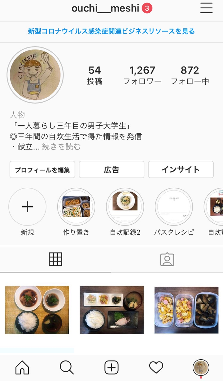 一人暮らし生活も3年目になりました。 4月から「自炊歴3年目の技を紹介する」をコンセプトにインスタグラムのアカウントを開設しました。 ターゲット層は「一人暮らし大学生」「一人暮らし大学生を持つ親世代」にしています。 思ったよりもフォローワーの伸びがいいので本気でインスタグラマー目指してます!!