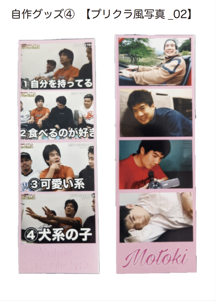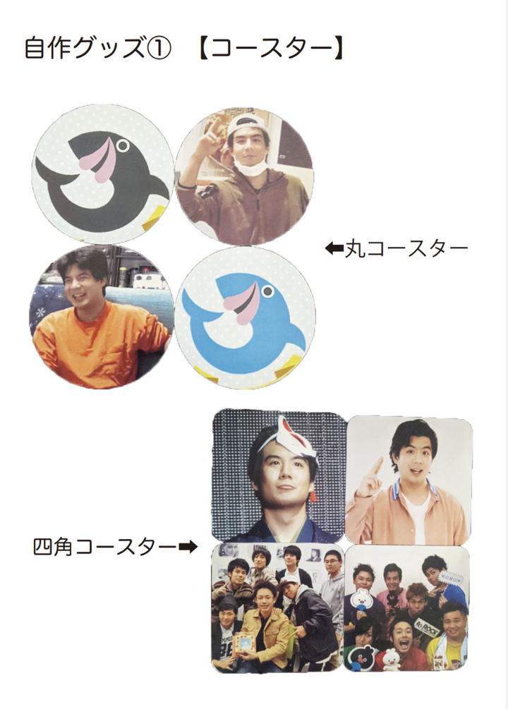 花宮りんさんというYouTuberの方の作り方動画を観ながら制作した自作グッズです。 ここに載せているのはほんの一部なのですが実際にはもっとたくさん制作しています。 コースターだと全部で「20枚」・チェキ風写真だと「40枚」ほど制作しました。 下記で各グッズの作り方をご説明させていただきます。 ①【コースター】使用アプリ:LINE Camara まず、LINE Cameraというアプリを開きます。次にコラージュということろを開き、4分割になっているものを押します。画面が4分割になったら好きな写真を4枚選び、写真の微調整をします。出来たら保存をします。次に印刷をします。各家庭で印刷する方もコンビニでネットプリントをする方もA4の普通紙で印刷をします。印刷が出来たら作業工程に移ります。詳しい作業工程は下記でご説明させていただきます。 《作業工程》 必要な物:ハサミ又はカッター・のり・紙コースター(ダイソーさんで購入しました) 1:印刷したA4の上に紙コースターを置きます。 2:ボールペンやシャープペンシル・色ペンでコースターの枠をとり、跡をつけます。 3:上のコースターを外し、枠の線に沿ってハサミ又はカッターで切ります。 4:枠の形に切り取ったA4又はコースターの片面にのりを塗り、貼り合わせて完成です! ②【ポストカード 】使用アプリ:Pics Art まず、Pics Artというアプリを開きます。次に画面の下にある「+」のマークを押して、好きな写真を1枚選びます。写真が選べたら、画面したのカテゴリーから「ツール」➡︎「切り抜き」の順番に押します。切り抜きが押せたら、比率を画面下の「3:2」にし、写真を微調整します。次に、画面下の「写真の追加」を押し、白色の画像を追加します。追加が出来たら白色の画像を下の画像に合うように微調整します。(この時に上の白色の画像と下の画像との余白(上下左右)を少し開けておいた方がいいかと思います) 微調整ができたら、白色の画像の透明度を35くらいに調整します。(特にこれくらいというのはないので好みの透明度でも大丈夫です) 透明に出来たら保存をします。保存が出来たら最初の画面に戻り、一番下まで画面をスクロールします。そしたら「カラー背景」から白色を選びます。選べたら先程と同じことをします。(「ツール」➡︎「切り抜き」➡︎比率「3:2」にする) 3:2に出来たら「ステッカー」を押し、ロゴを調べます。探していたロゴが見つかったら、そのロゴを真ん中に置きます。(サイズはお好みで) ロゴ配置が出来たら保存をし、最初の画面に戻ります。戻ったら「コラージュ」から「グリッド」を押します。ポストカードの加工画を4枚選びます。選んだら横に2枚、縦に2枚ずつ並んで4分割になっているものを選びます。比率を3:2にし、枠線の色を選びます。(お好みの色で) 出来たら保存をします。次に印刷をします。各家庭で印刷する方もコンビニでネットプリントをする方もA4の普通紙で印刷をします。印刷が出来たら作業工程に移ります。詳しい作業工程は下記でご説明させていただきます。 《作業工程》 必要な物:カッター又はハサミ・のり・ケント紙(Seriaさんで購入しました)又は厚紙 1:印刷したA4の紙を枠の内側の線に沿って(線だけを残して)カッター又はハサミでカットします。 2:カットが出来たらケント紙又は厚紙に表だけ貼ります。 3:貼った部分をカットします。 4:表面の部分のカットが出来たら同じケント紙に裏面を貼って完成です! ③【プリクラ風写真】使用アプリ:Pics Art まず、Pics Artというアプリを開きます。次に画面の下にある「+」のマークを押して、画面の一番下までスクロールし、好きな色の画像を1枚選びます。もし好みの色が無い場合はカラーピッカーで色を作成してください。色が決まったら画面下のカテゴリーから「ツール」➡︎「切り抜き」の順番に押します。切り抜きが押せたら、上側のカスタム比率のWを「3464 ➡︎ 1155」に設定します。設定が出来たら適用を押して土台の完成です。土台が出来たら画面下の「写真の追加」を押し、好きな写真を4枚選びます。そしたら写真を1枚タップして画面下の「切り抜き」を押します。押せたら比率を画面下の「3:2」にし、写真を調整します。調整が出来たら「適用」を押します。この作業を選んだ4枚の写真全てに行います。4枚とも出来たら写真を大きくし、位置を調整します。写真同士の間隔はお好みで調整してください。位置と間隔が決まると画像のようになります。下の空いたスペースに好きな文字を入れます。もじが決まったらフォントや字体の色を決めます。この時の注意点は「👑マーク」がついているものは課金になるのでご注意ください。文字が出来たら保存をします。保存が出来たら最初の画面に戻り、一番下まで画面をスクロールします。そしたら「カラー背景」から白色を選びます。選んだら画面下のカテゴリーから「ツール」➡︎「切り抜き」の順番に押します。切り抜きが押せたら、「フィード」を選びます。選べたら作った