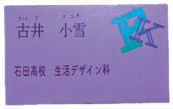 この2つの作品は、私が高校3年生の時に今の専門学校のオープンキャンパスで制作したものです。 1枚目:名刺 背景は高校の時、入学していた学科のイメージカラーを配色しました。右上にあるロゴは私のイニシャルである「FK」を少し変形させ、組み立てている感じを出しました。 2枚目:ビンなどに貼るシール ビンをみた時に「飴」を入れたいなと思ったので《Candy Box》というシール名にしました。