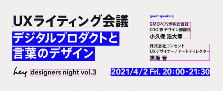 2021年4月2日に開催されたヘイ株式会社主催hey designers night vol.3「UXライティング会議 - デジタルプロダクトと言葉のデザイン」に登壇しました。