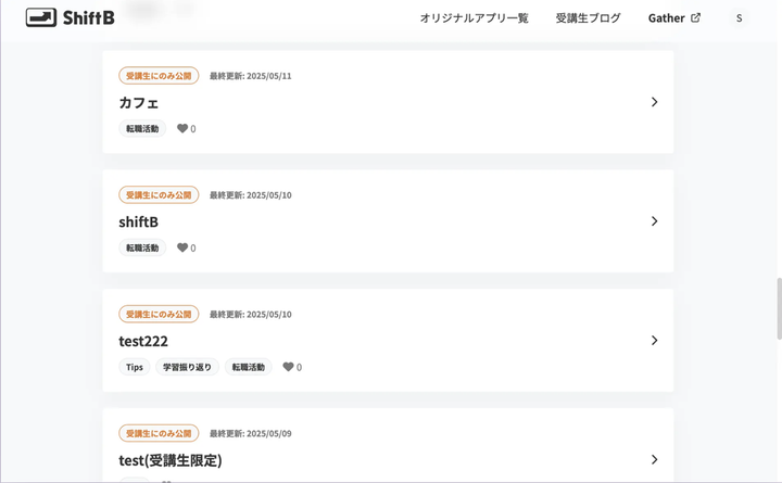 ShiftBブログの記事をプライベート公開(ポータルサイトにログイン中の受講生にだけ表示)できるようにする 依頼元 株式会社: bubekichi https://bubekichi.com/ 担当範囲 バックエンド実装 フロントエンド実装 使用技術 フロントエンド Next.js React TypeScript バックエンド Next.js Prisma TypeScript Supabase
