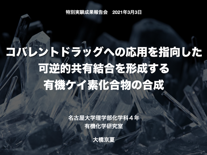 私は研究室で有機化学を専門とし、薬剤に関する研究テーマを遂行しています。このテーマは研究室内で先行研究が無かったため、研究の方向性や化合物合成などの様々な困難に直面しました。中でも大きな困難は、3ヶ月以上かけてようやく得られた化合物が、想定の反応性を示さなかったことです。私は、1人で問題を解決しようと論文を検索し、あらゆる解決策で試行錯誤しましたが、問題を特定することができませんでした。そこで、視野を広げるために先輩・先生や専門外の先生のもとへ足を運び、何度も議論を重ねました。多くの失敗から成功が生まれると信じ、1ヶ月間に普段の3倍以上である70もの実験を行いました。この結果、反応性の評価方法に問題があることを見出し、研究を大きく推進することができました。以上のように私は、持ち前の粘り強さを活かして努力を継続することで、周りを巻き込みながら困難を乗り越えることができます。
