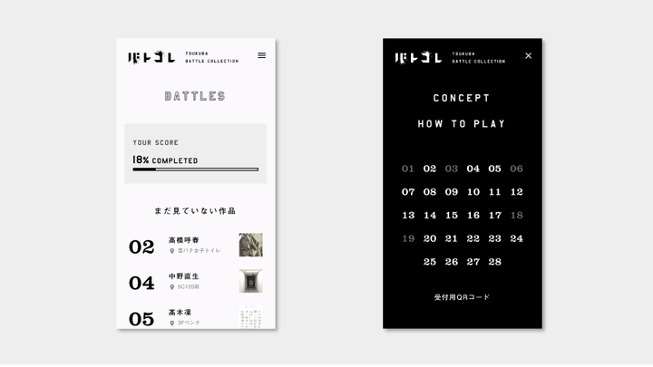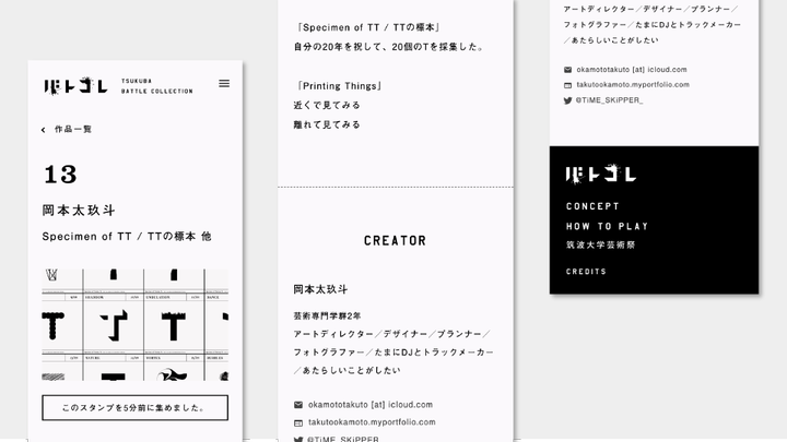 学園祭での芸術専門学群生を中心としたアート展示で、企画Webサイトおよびデジタルスタンプラリーの開発を担当。会場内に点在した作品のキャプションに印字されたQRコードをスマートフォンで読み取ると、企画Webサイト上でスタンプラリーができる。アートディレクターの印刷物向けのコンセプトデザインをWebに展開する作業をも担当した。