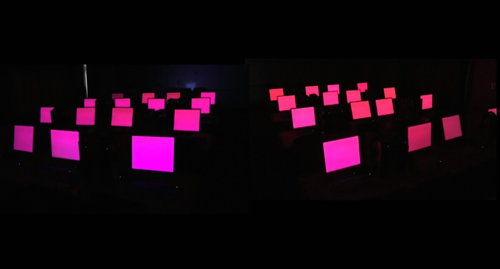 音楽のビジュアライズを空間上に展開し、没入感ある体験を可能にしたインスタレーション。並んだディスプレイを誤差なく制御し、空間に模様を描くことを実現した。