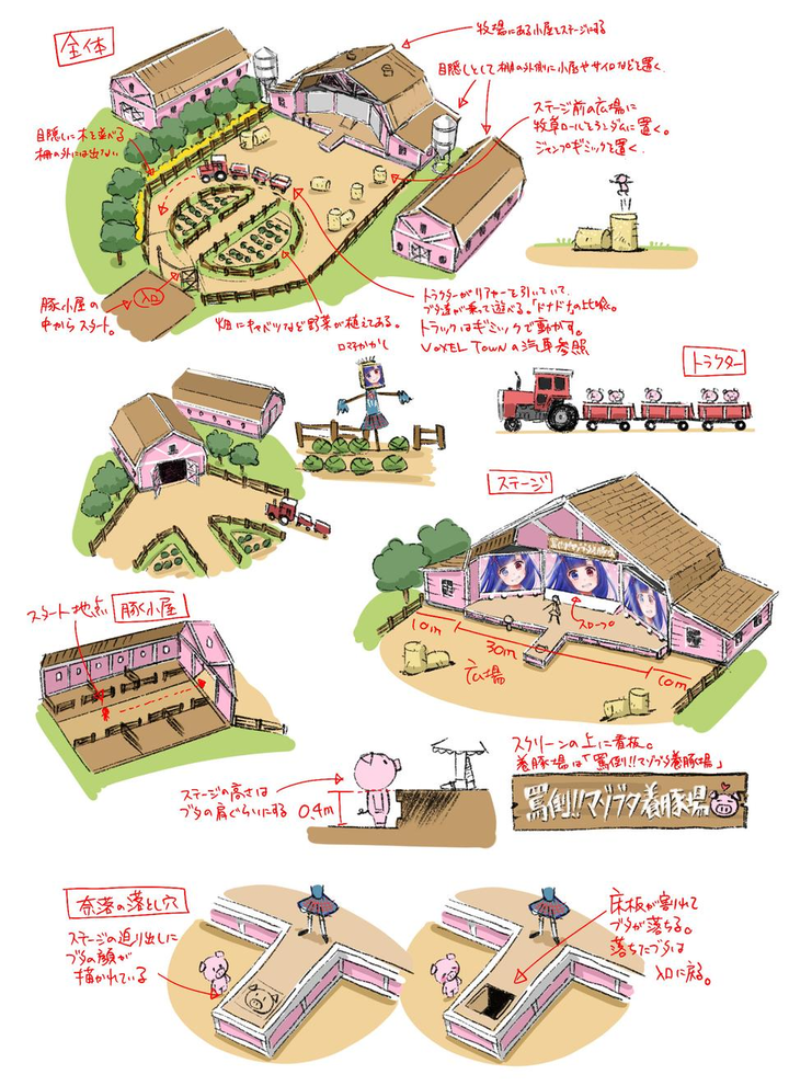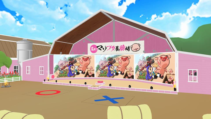 罵倒系VTuber ・黒尻ロマ子のワールド。アバターは全員ブタになる。養豚場の豚舎が並び、正面の豚舎がライブステージになっている。中央の畑にトラクターが走り、後ろの荷台に乗ることができる。OXクイズの時には、ハズレの床が抜けてブタたちが「奈落の底」に落ちる仕組みになっている。ワールドデザインと設定画、モデラーへのデザイン監修など担当。