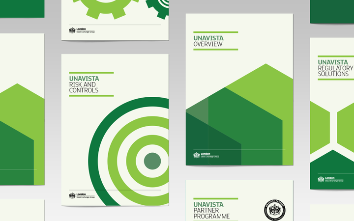 UnaVista is London Stock Exchange Group’s platform for matching, validation and reconciliation products. The identity is flexible to accommodate the different offerings. There is no defined logo, but a consistent use of color and shape defines the brand.