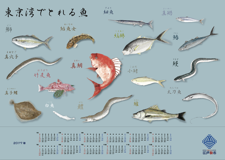学内の課題で、“東京の地産地消”を促すイベントの企画提案をグループでした際に、グッズプロモーションとして製作したポスターです。 目的はこのポスターを持ち帰って頂くことで、イベントを思い出してもらうことです。 魚のイラストは手描きで描いたものをデジタルで生き生きとした魚になるように彩色しました。このポスターを持ち帰ってからも、部屋に飾って見て頂くために、カレンダー式のポスターになっています。
