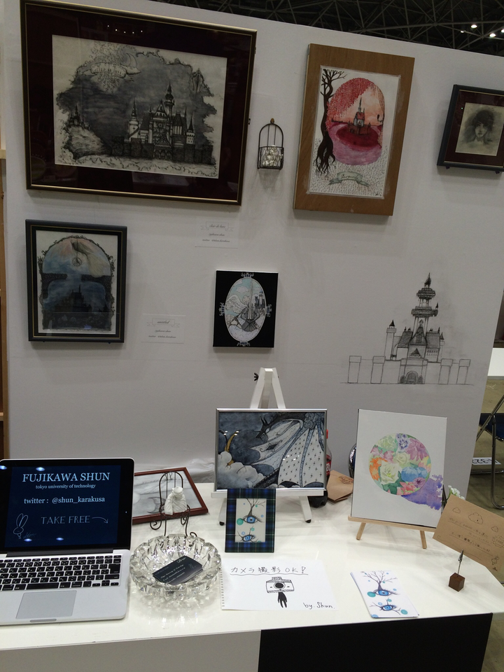 東京ビッグサイトで行われたデザインフェスタvol.43にて、出展した際の展示風景です。 絵を7点と小さいハガキサイズの絵を複数枚製作し、ライブペイントで壁にお城の絵を描きました。