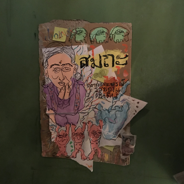 渋谷rootで開催されたWilliam Breakでライブペイントを行ったときの作品。 テーマは決めずに描き始めたものだったが、右下の水が湧き出るお祈りを捧げる作品になった。ダンボールや画用紙を破りポストイットを貼り付けコラージュしたアクリル作品。