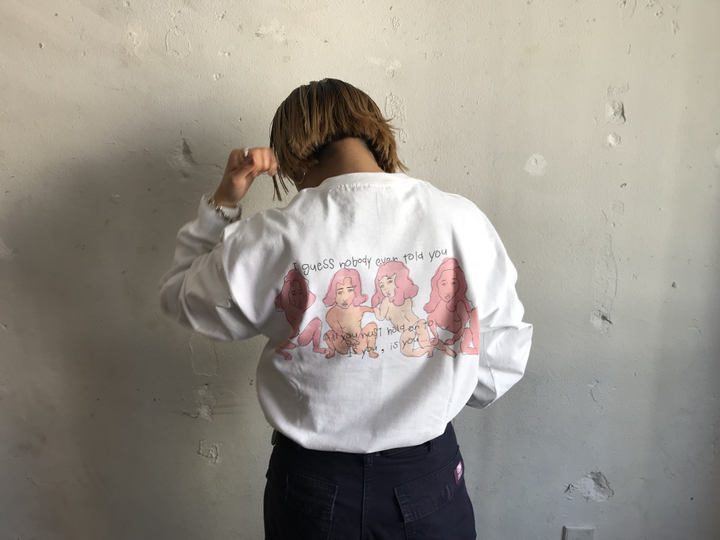 二人展Booty Sleepに向けて描いたアクリル作品をバックにプリントしたロングTシャツ。フロントの右胸に手書きロゴをプリント。展示にてメンズS〜Lサイズを販売。
