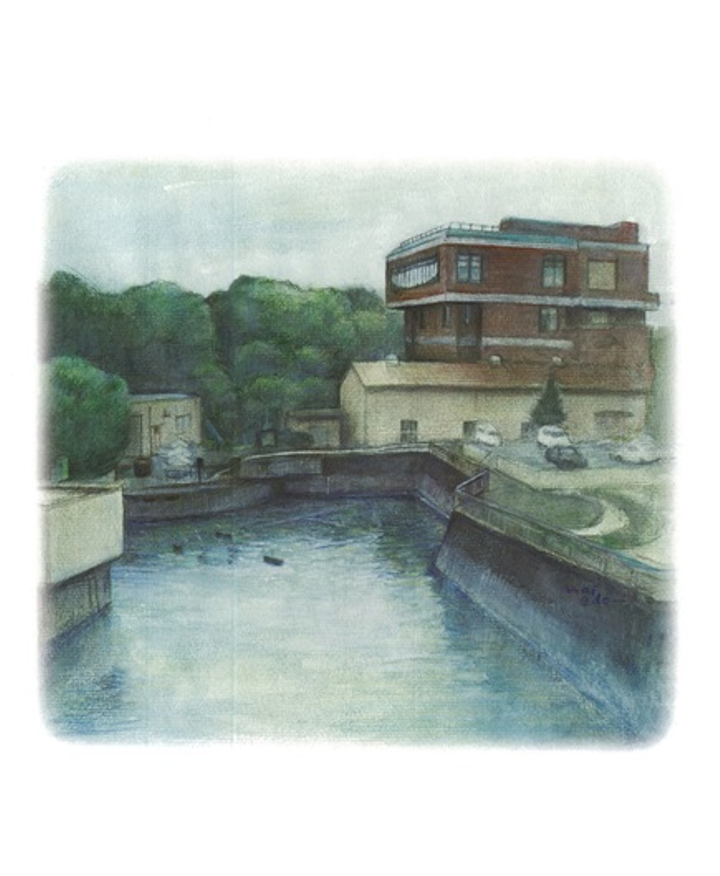 静岡県沼津市水道水の最大の水源地、‘泉水源地(駿東郡清水町八幡)’の施設紹介パンフレットの表紙イラストを担当。 豊かな緑に囲まれた場所で静かな時の流れる水源地の様子を描きました。/ (色鉛筆、水彩、鉛筆)
