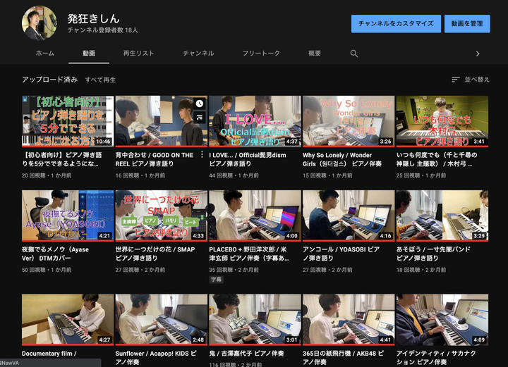 ピアノ伴奏や弾き語りの動画を22本、その他「【初心者向け】ピアノ弾き語りを5分でできるようになる方法」などを投稿