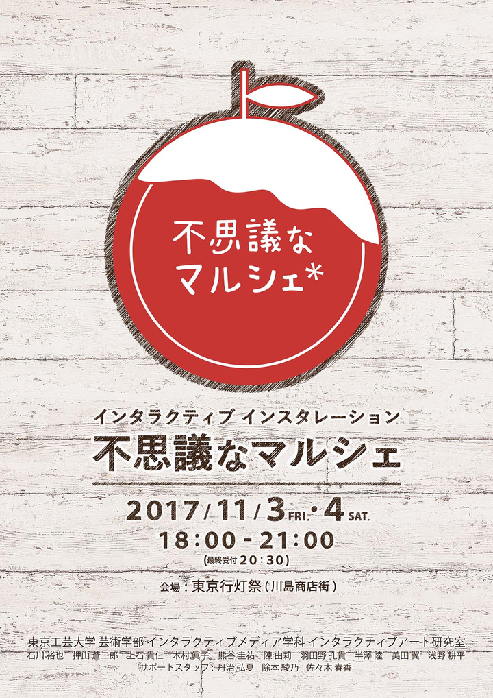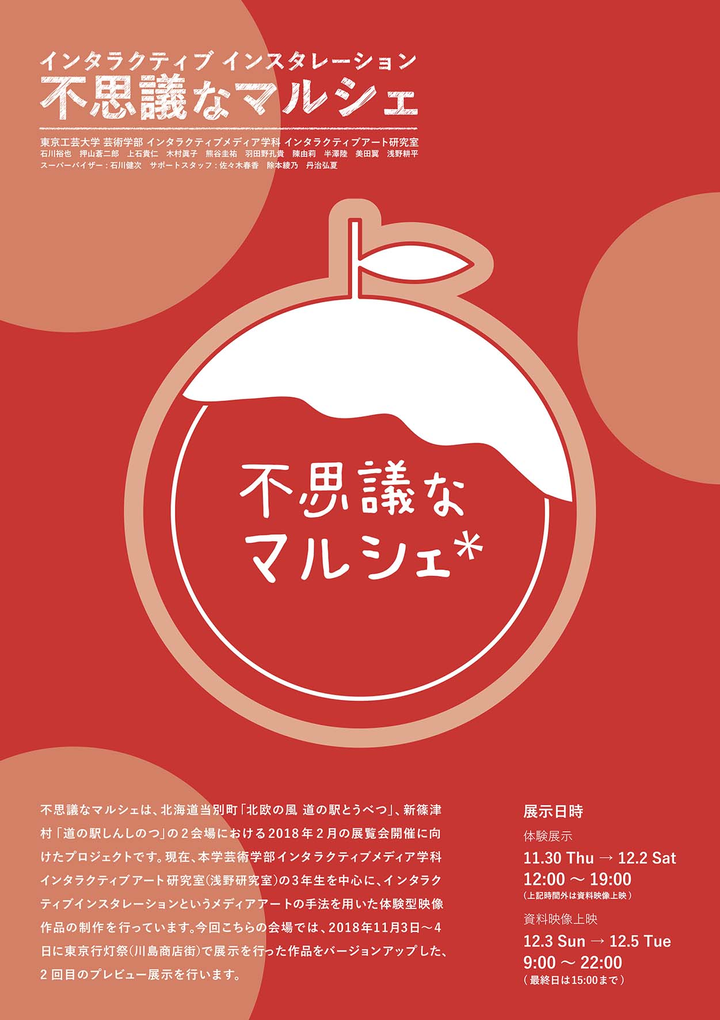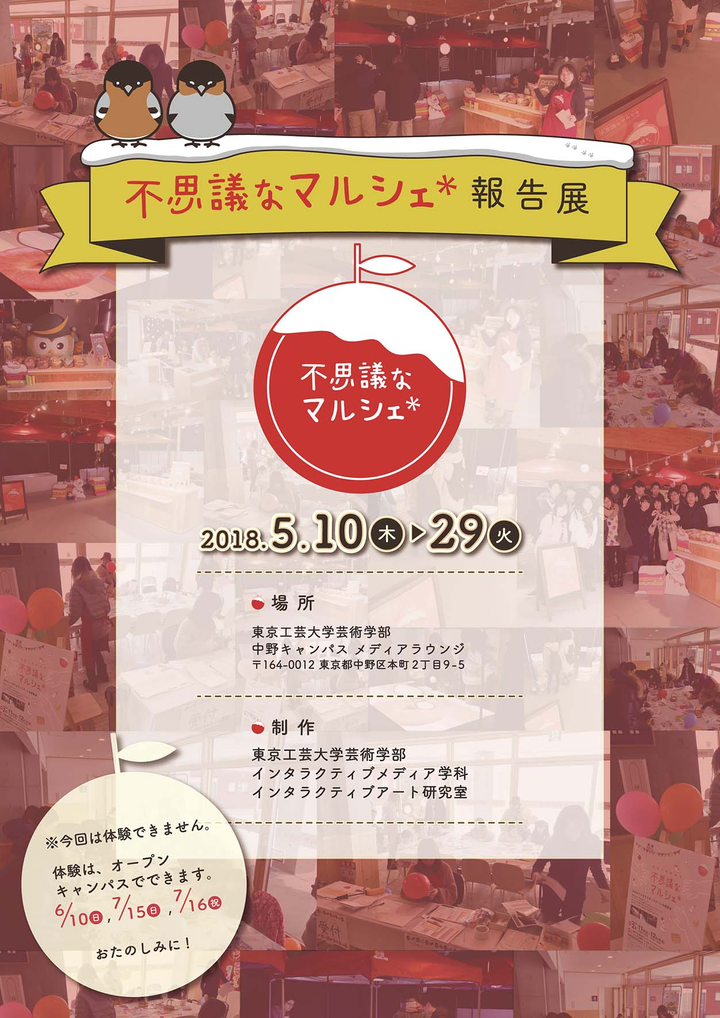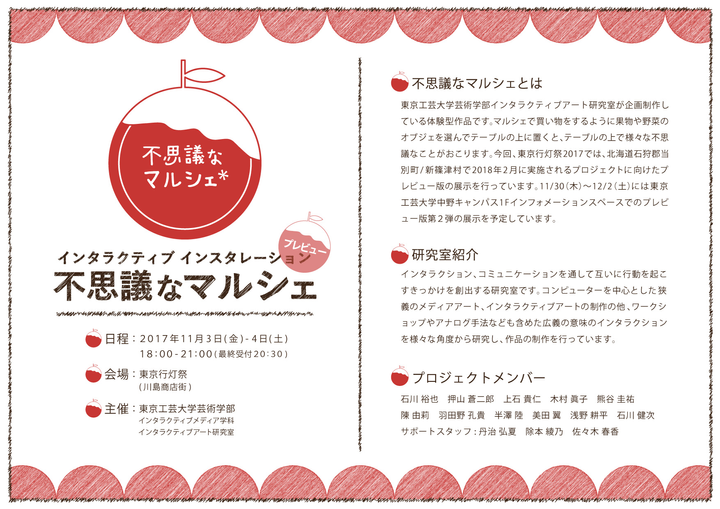 赤を基調とした目立つデザイン 不思議なマルシェのプロジェクトではポスターやフライヤーなどのヴィジュアルデザインに関わる部分を担当しました。長期間のプロジェクトだったので、多くの方に知ってもらえるよう全体的に目立つようなデザインにしました。
