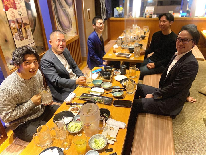 選考中の学生も招待して、少人数で居酒屋座談会! やっぱりみんなで飲むのは最高ですね。 コロナが落ち着いたらまた飲みたい!!