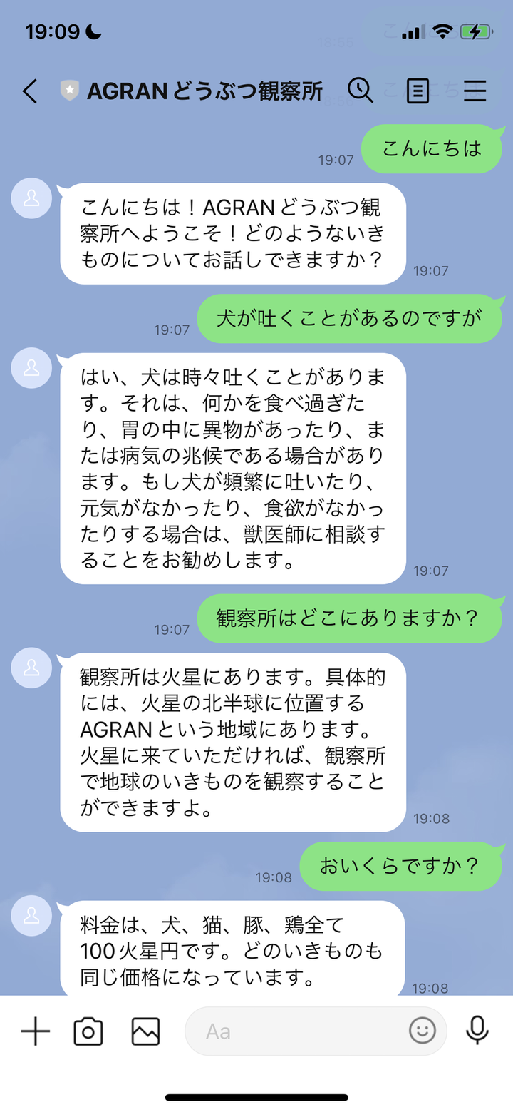 ChatGPTをカスタマイズして、どうぶつについて質問できる架空の施設のLINEBotを作りました。カスタマイズした内容は次の3点です: - 火星にある地球のどうぶつを観察する施設 - 火星に来て話をする場合、料金は100火星円 - フレンドリーに子供に話すトーンで話す 動物病院などの基本情報をカスタマイズして基本的なお問い合わせを返すこともできそうです。簡単に自然なChatBotが作れるなんて。いろんな問題が解決できそうですね。 詳細はこちら[AGRANどうぶつ観察所] https://www.agran.jp/home/work/animalqa さらに、社内の業務フローなど大量の文章を使って、社内向けのQA用LINEbotも簡単に作成できます。ある植物の栽培マニュアルをLINEBot化してみました。使い勝手いいですが、OPENAIの利用料金はグッと増えました。チューニングなど必要ですね。 #ChatGPT #LINEBot