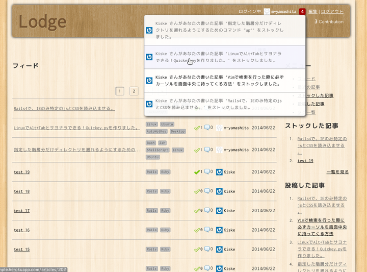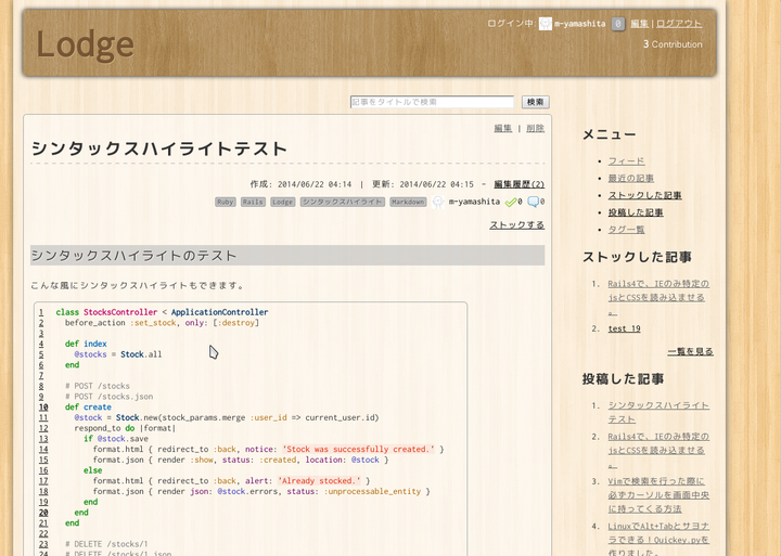 OSSの社内ナレッジ共有サービスです。 Markdownにて記事を書き、Tag管理や興味のある記事のストックなどができます。 またSolr+Sunspotによる全文検索も可能です。 すでに数々の現場で実戦投入されている実績があり、 私自身業務で今現在も利用しています。 現在はバグ修正を主として不定期にメンテナンスしています。 【自身によるローンチ時の紹介記事】 http://qiita.com/m-yamashita/items/d6f64db461acd54095f7 【WEBメディア掲載記事】 Lodge - 社内で使えるナレッジ共有サービス http://www.moongift.jp/2014/07/lodge-%E7%A4%BE%E5%86%85%E3%81%A7%E4%BD%BF%E3%81%88%E3%82%8B%E3%83%8A%E3%83%AC%E3%83%83%E3%82%B8%E5%85%B1%E6%9C%89%E3%82%B5%E3%83%BC%E3%83%93%E3%82%B9/