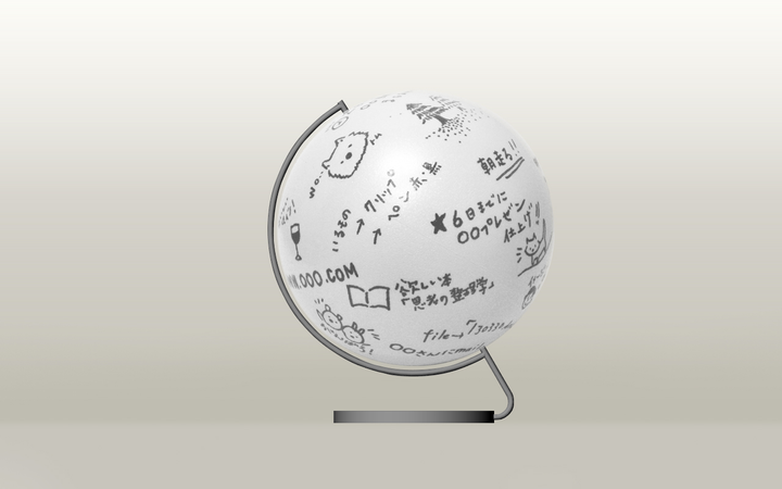 ■ client : competition (japan) ■ contents : Product Design 回転する球体のホワイトボード。普段の生活 の中で気軽に楽しみながらメモをとる事が 出来たらという思いをかたちにした。本体が 回転する球体であるため、書き始めの位置 を限定せず、回しながら自由な場所にメモを とる事が出来る。また、その特性により、意図し ない言葉や文章、スケッチ等が隣り合ったり する偶然性から、新しい発見やアイディアが 生まれるきっかけをもたらすものになる事 を期待したデザイン提案。 ※「ナカバヤシデザインアワード2013」にて優秀賞を受賞。