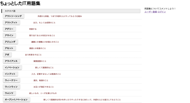 ★概要 ちょっとした専門用語の意味がわかります。 ユーザー登録をすると、コメント機能を扱うことができます。 コメント機能では、用語に対する意見など、気になった事を、コメント出来るスペースとしています。 ★本番環境(デプロイ先) https://grossary.herokuapp.com/posts ★制作背景(意図) 自分が未経験で、IT業界でどの様な用語が使われ存在するのか、気になった事がきっかけで、このアプリを作ってみたいと考えました。
