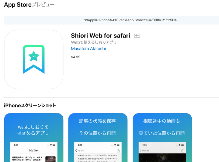 【概要】 Webコンテンツのスナップショットを保存できるアプリ 【機能】 ざっくり言うとより便利なブックマークアプリです。 単なるブックマークとは異なり、Webページに加えて以下の情報を保存・復旧します。それによって、ブックマークしたコンテンツを「ちょうど見ていた位置」で再開したり、共有することができます。 - スクロール位置保存・復旧機能 - 動画再生位置保存・復旧機能 - PDFページ数保存・復旧機能 - テキストへのリンク作成・保存機能 - 共有機能 複数のデバイス間で使用可能です。 【技術】 - バックエンド: Ruby on Rails, Golang, AWS(Lambda, S3, CloudFormation, Textract) - モバイルアプリ: Swift - Chrome拡張機能: TypeScript 【その他リンク】 - アプリ - スライド: https://github.com/web-shiori/Shiori/blob/main/%E6%8A%80%E8%82%B2%E5%B1%952021%E7%99%BA%E8%A1%A8%E3%82%B9%E3%83%A9%E3%82%A4%E3%83%89.pdf 【登壇・評価等】 技育展2021登壇 15000ダウンロード突破しました。 日本appstoreにおけるニュースカテゴリの有料アプリランキングで1位を達成(2020.03.17) 中国appstoreにおけるニュースカテゴリの総合ランキングで118位達成(2020.03.06) 韓国appstoreにおけるニュースカテゴリの総合ランキングで4位達成 その他、台湾・香港等においてもランキング入り