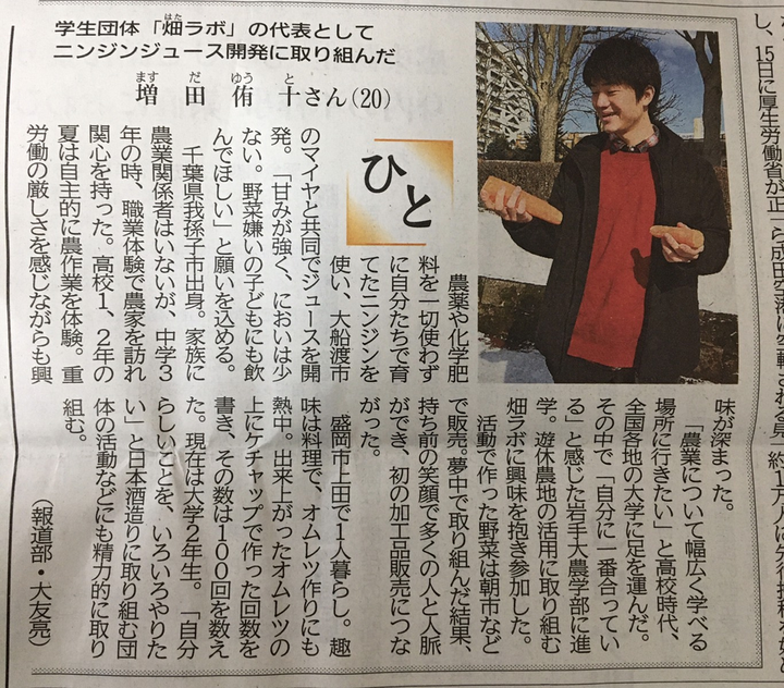 千葉県の一般家庭で育ち、学年300人いる中学校の職業体験で農業を希望する人が2人しかいない事実に対して「なんで自分の同年代は農業に興味がないのか」ということに疑問を抱き、高校では自分から農家を見つけ高校1年生の時に愛媛・高校2年生の時に岩手へ2週間ずつ研修参加しました。大学では農業について体系的に学べる学科に入学しながら課外活動に取り組んできました。やると決めたら何事にも全力です!