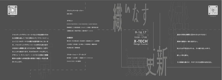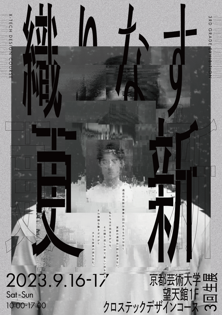 京都芸術大学クロステックデザインコース3回生で 展覧会を企画、プロジェクトマネージャーを務めました。 展示企画、空間設計、会期中の運営・管理と来場者への対応、搬入出など、 展覧会におけるすべての仕事とプロセスを恊働し、これら実践を通して総合的に空間プレゼンテーションを学びました。 「織りなす更新」 過去の失敗は善悪に囚われるものではなく 更新の道程の一部に過ぎない。 私たちは不完全ながらも、その繰り返しの中で、新しい形を探る。 その微細な動きが、やがて大きな変革の波を生む。