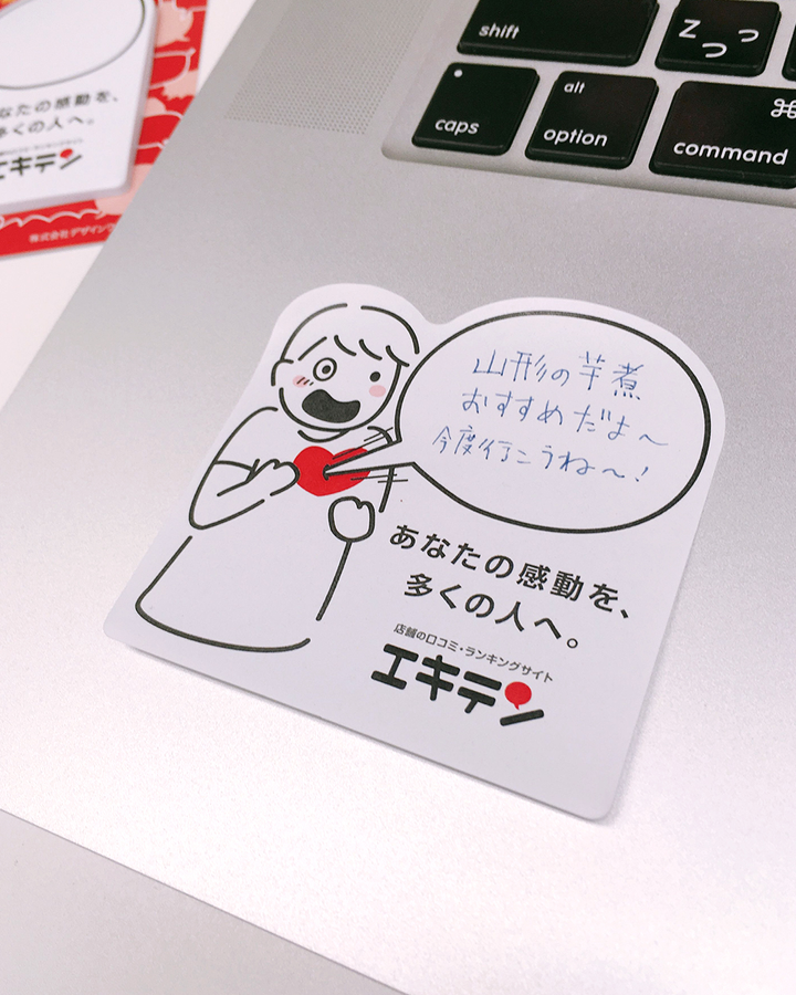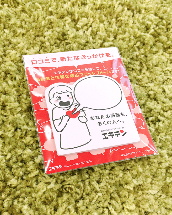 企業訪問時のアイスブレイクとして目を引く・話題となるノベルティが欲しいとのことだったので、インパクトのある付箋を作成しました。 「あなたが感動して書いた口コミが、他の多くの人に伝わるかもしれない」というコンセプトを元に、口コミが人間のハートにささっているイラストを用いています。