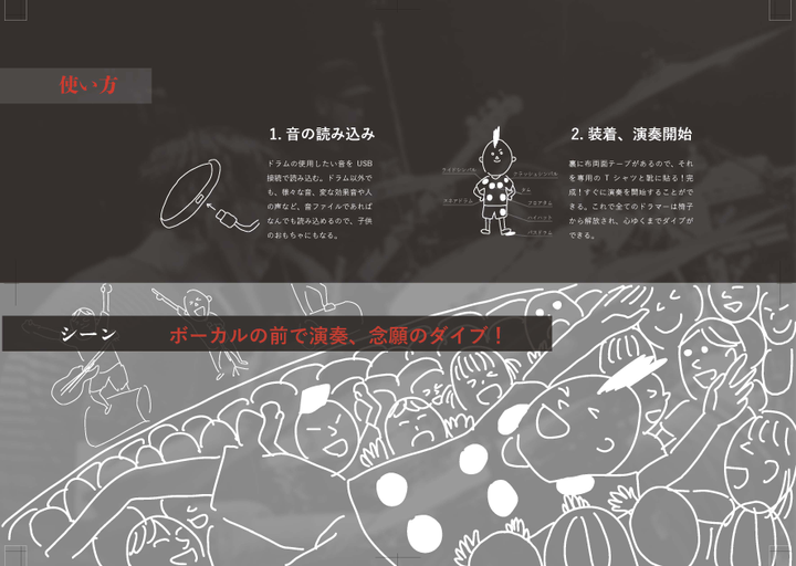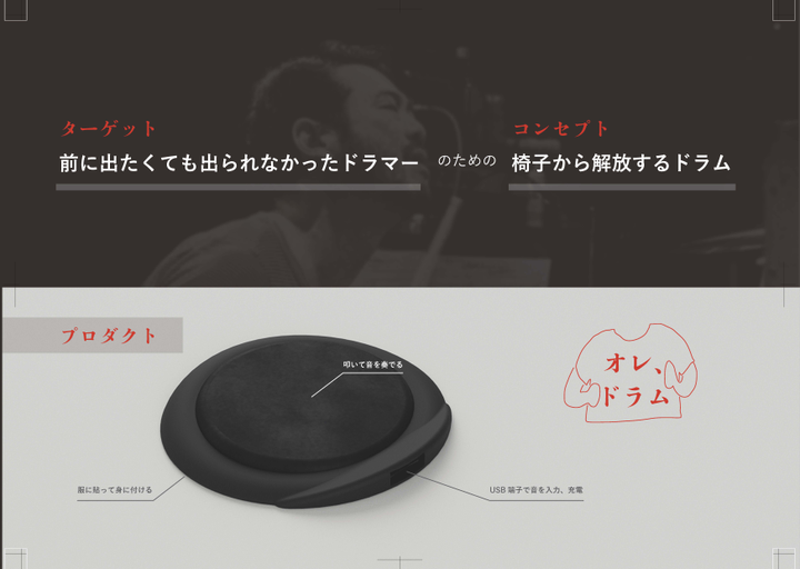 (1)オレドラム 2014.7 いつも後ろのドラマーがフロントマンになれるプロダクト (2)おばあたま 2018.2 味覚が衰えてきた料理上手のおばあちゃんを手助けするプロダクト