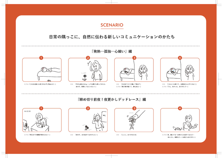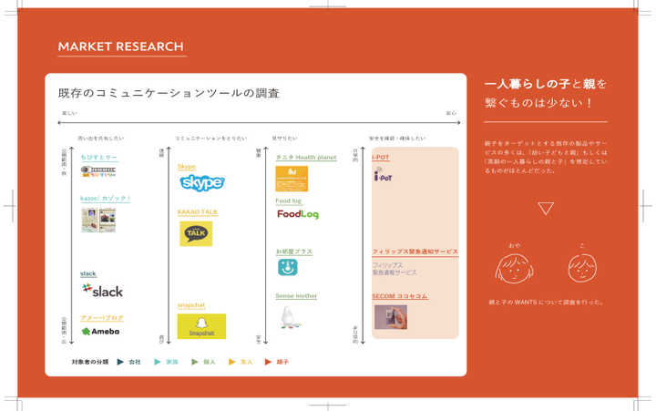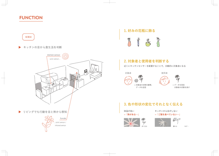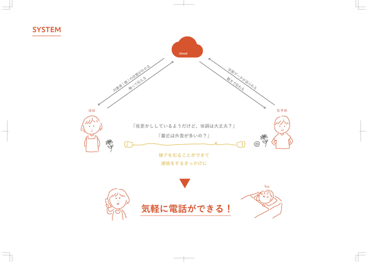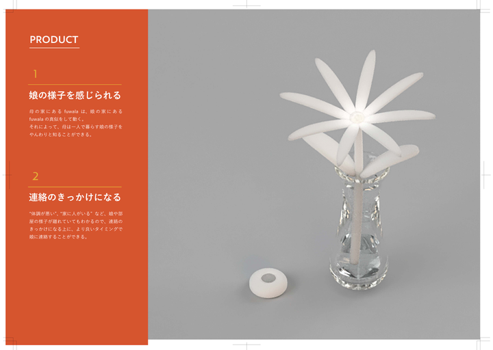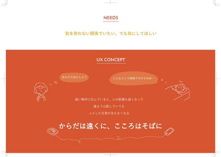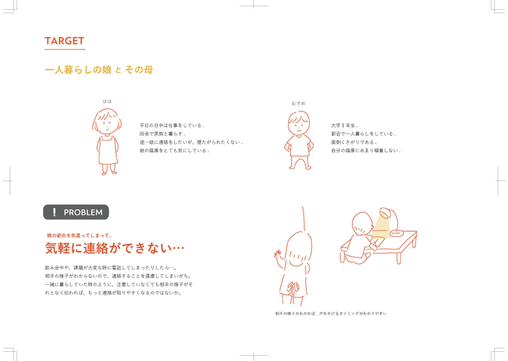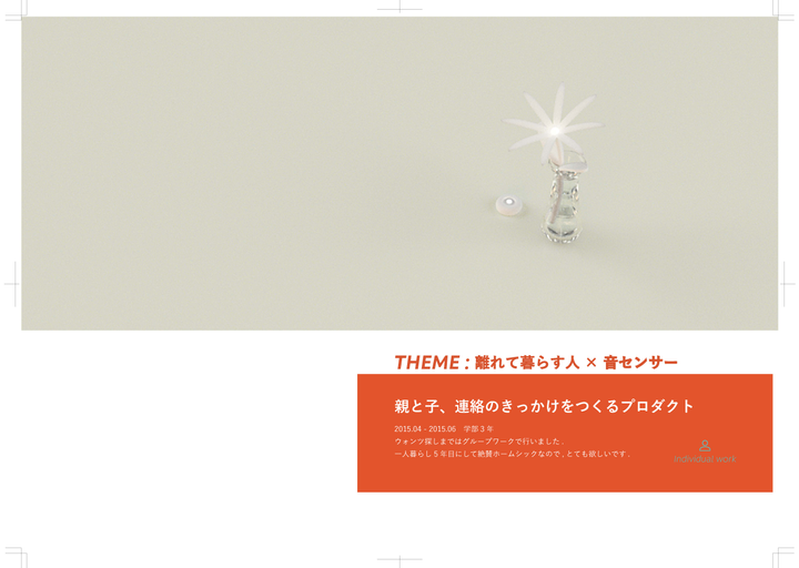 離れて暮らす人×音センサーというテーマで取り組んだプロダクトです。離れて暮らす親と子を、お互いの暮らしの中でさりげなく結びつけることを目指しました。