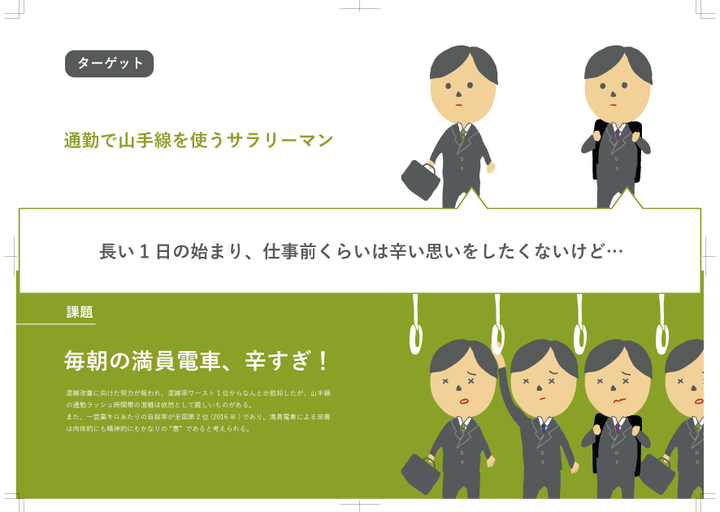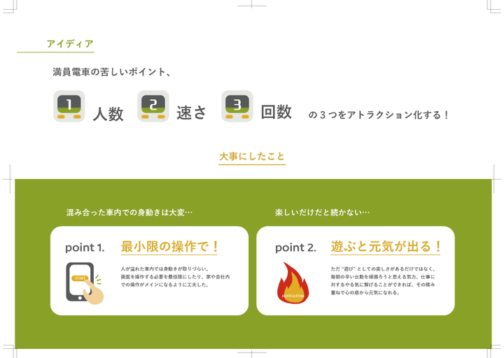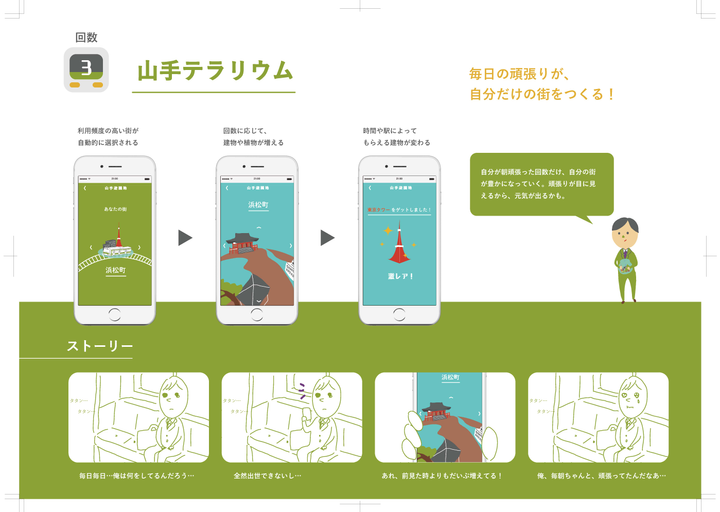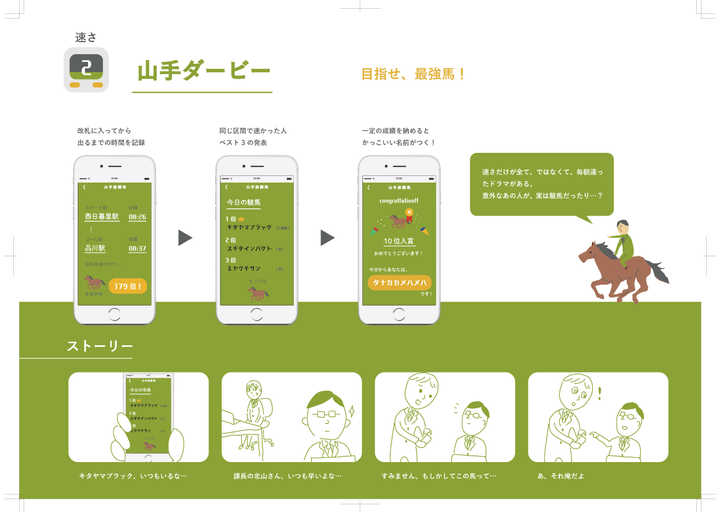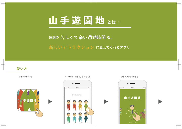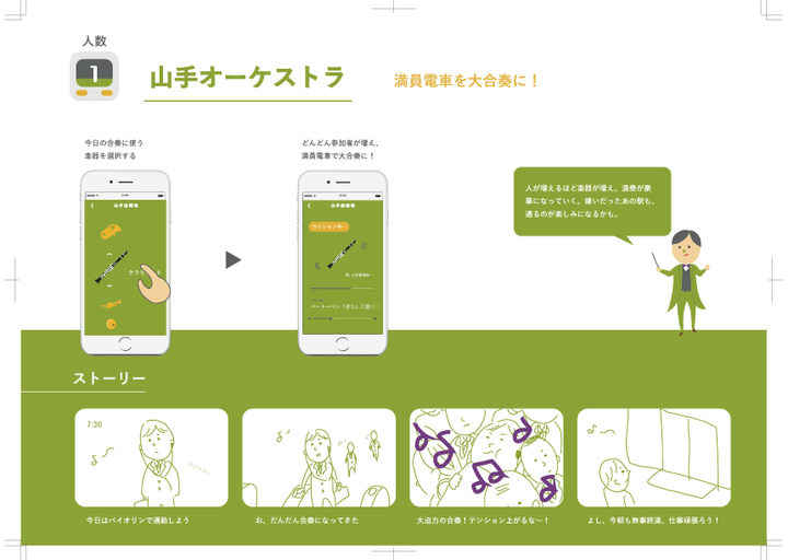 Sonyの夏のワークショップで作ったグループワークのアイディアから、「山手線」のテーマだけ抜き取ってブラッシュアップしたものです。毎日の通勤を少しでも楽しくできるアプリを目指しました。
