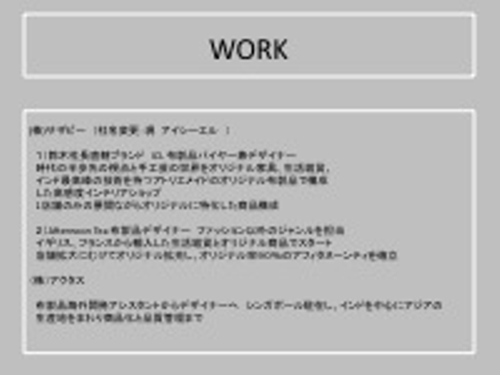 総合インテリアショップ。 販売からスタート。 アルバイトから社員になり本社へ異動後 新規出店・リニュアルのディスプレィ担当を経て、商品開発部へ。