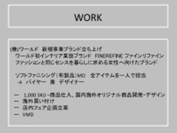 FINEREFINE ブランド ファブリック担当。 ワールドの手掛けるインテリアショップfinerefine(ファインリファイン) ファッションと同じセンスを暮らしに求める大人の女性たちのために、独自に編集されたセグメントごとに展開。ワールド初のインテリアブランドの新