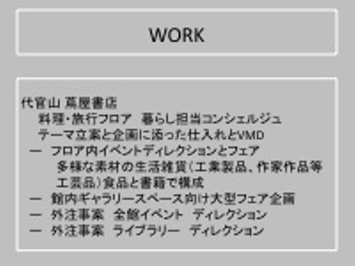 ■ 担当フロア(料理・暮らし) \ 衣・食・住の三点を多角的に見せる。売り場はMEDIAだ! ① 暮らし書籍棚の仕入れなど棚の構成と売り上げ責任者 ② 大小イベント企画を年間25−30本企画立案、実行、検証