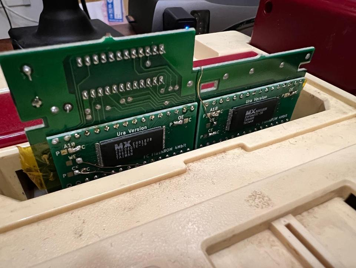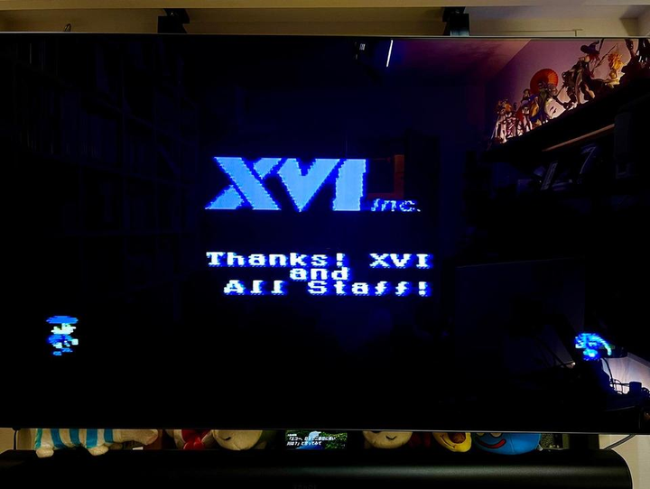 当時仕事で関わっていたXVIにて、請け負っていた仕事を行いつつ余った時間でファミコンソフトを自作していました。 自作と言っても市販のパーツで書き換え可能なROMを制作し、市販の書き換え可能な本体を制作し、簡単なプログラムでBGとCHRを書き込んで操作できるものでした。 仕事に参加させてもらった事と、XVI社への感謝を意を込めて契約満了&忘年会パーティで披露させていただきました。