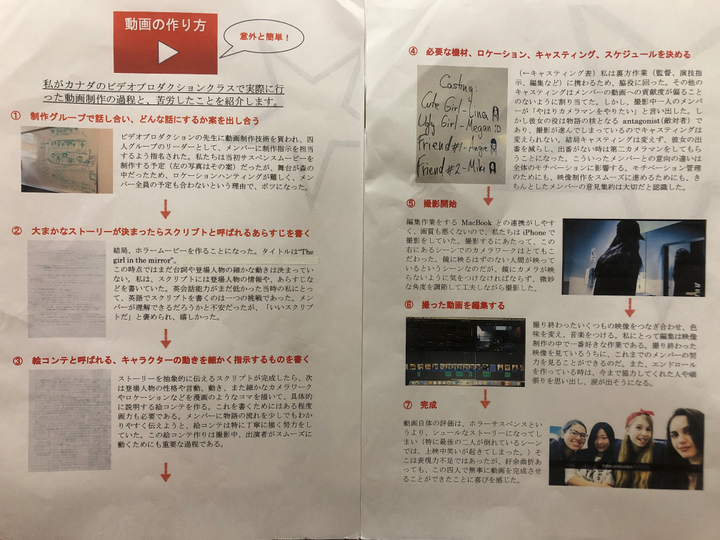高校生の頃に1年間留学していた、カナダでの動画制作の過程です。当時、動画制作の授業を取っていて、年間を通して10本ほど動画を制作していましたが、主に監督、プロデューサー、編集を担当することが多かったです。