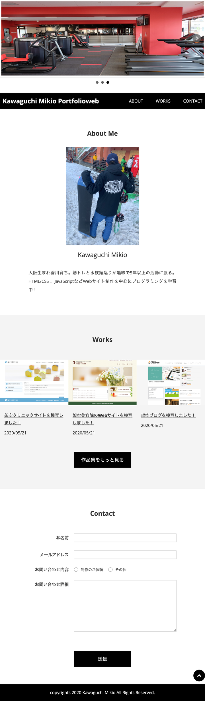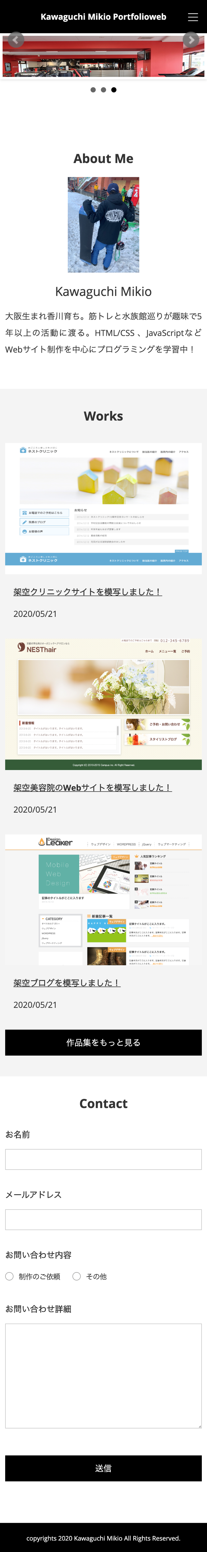 HTML/CSS、JavaScriptを用いて自己紹介HPを作成しました!ハンバーガーメニューの実装やレスポンシブ対応も行っています!