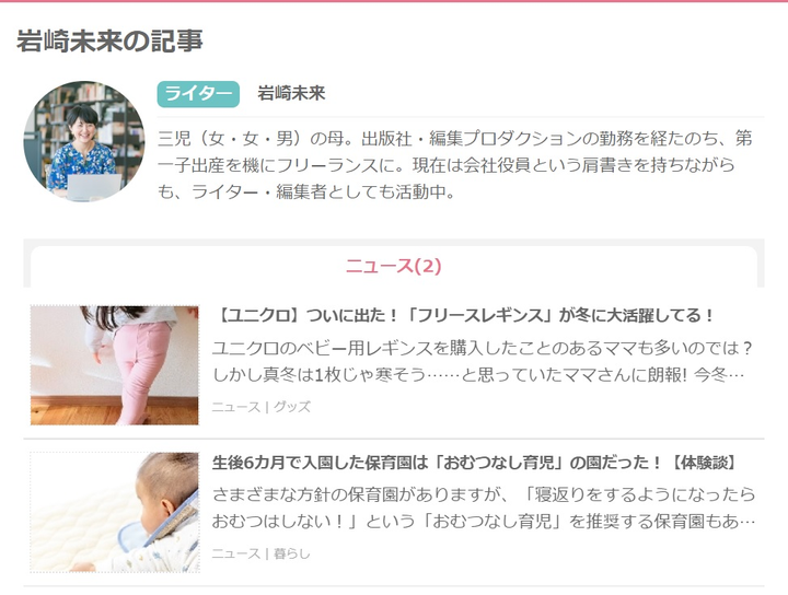 『ゆたり』(http://www.yutari.jp/) 『BRAVA』(http://brava-mama.jp/) 『住まいの大学』(https://sumai-u.com/author/iwazaki_mirai/) 『おやここ』(http://kiryu-oyacoco.jp/)